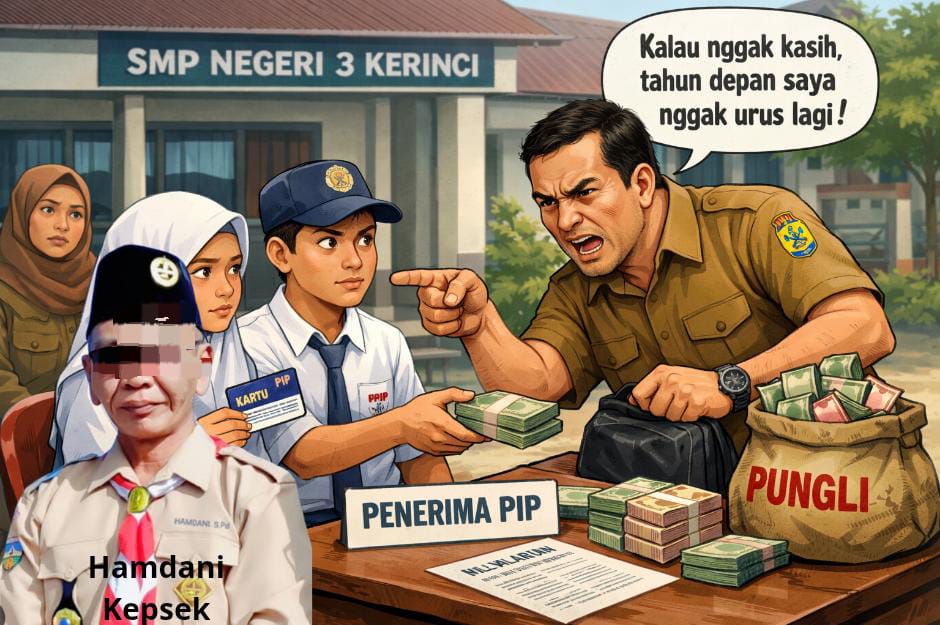 Kerinci – jambiaktual.co.id Dunia pendidikan Kabupaten Kerinci kembali tercoreng. Seorang oknum guru berinisial MJ, yang bertugas di SMP Negeri 3 Kerinci, diduga meminta uang sebesar Rp50 ribu kepada siswa penerima Program Indonesia Pintar (PIP) dengan cara intimidatif.