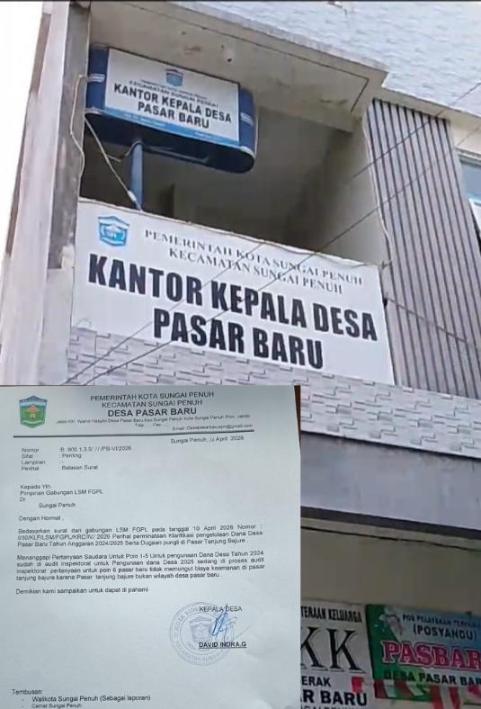 Sungai Penuh – Dugaan penyelewengan Dana Desa (DD) di Desa Pasar Baru, Kecamatan Sungai Penuh, Kota Sungai Penuh kini benar-benar meledak ke ruang publik. Gabungan LSM FGPL (Fakta, Grep, Pedas, Limbah) resmi turun tangan dengan melayangkan surat klarifikasi kepada Kepala Desa.