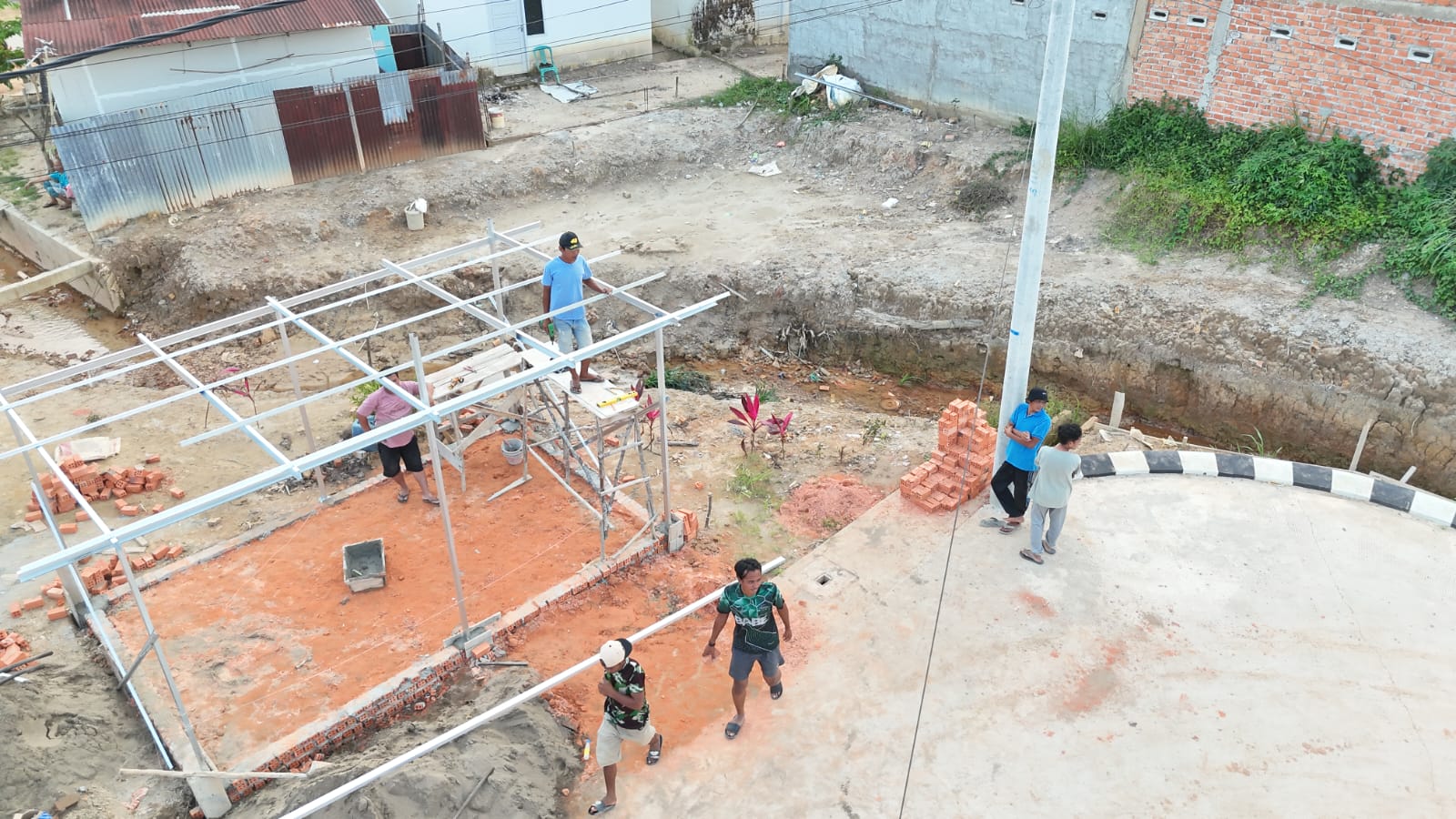 Yang menarik, seluruh proses pembangunan dilakukan secara swadaya dan gotong royong. Para bapak-bapak bersama pemuda lingkungan tampak bahu-membahu, mulai dari persiapan material hingga pengerjaan fisik bangunan.