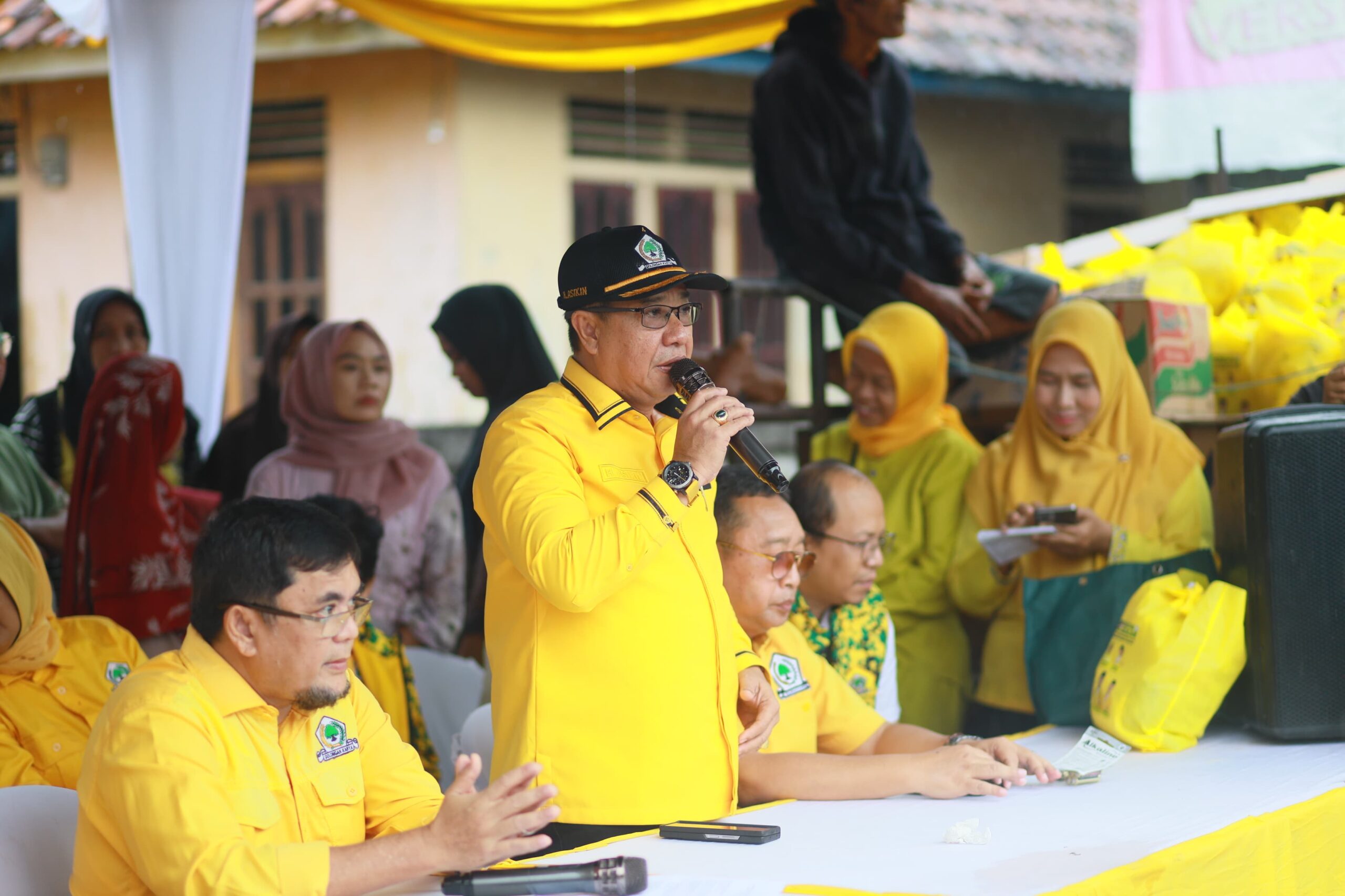 H. Asikin tampak aktif mengatur jalannya kegiatan sejak pagi. Dengan mengenakan baju kuning khas Golkar dan topi sederhana, ia menyapa satu per satu warga yang datang sambil memastikan seluruh kebutuhan peserta terpenuhi.