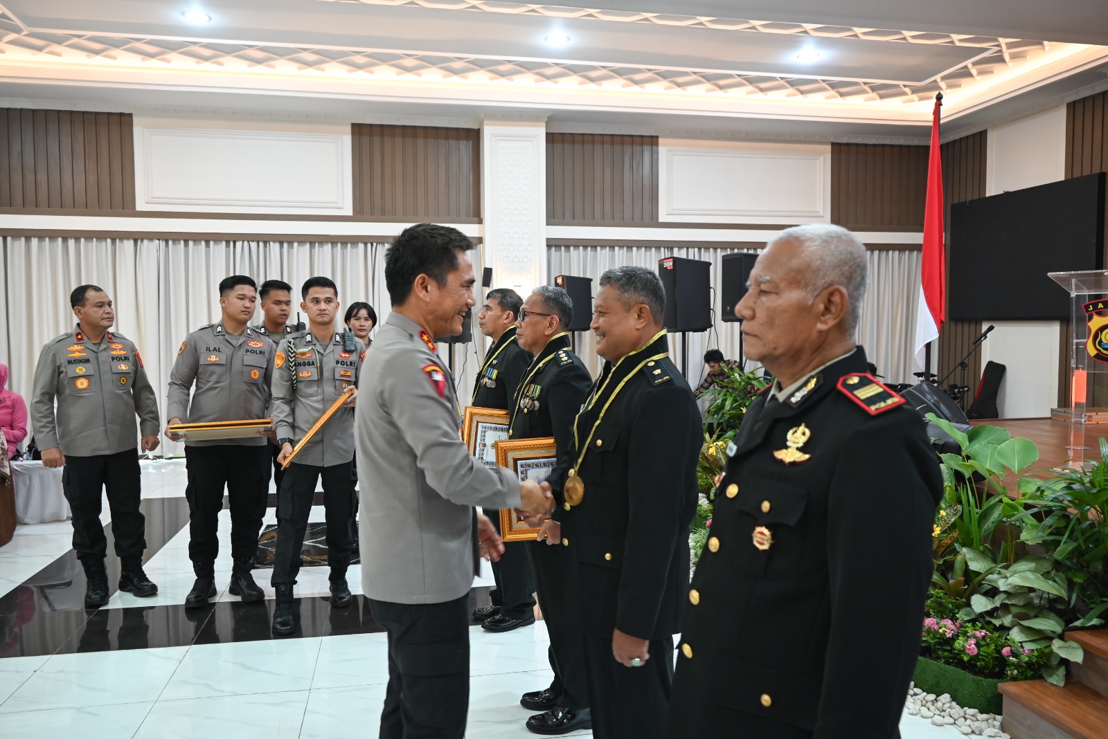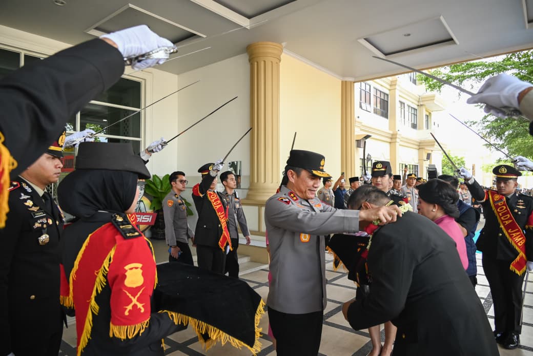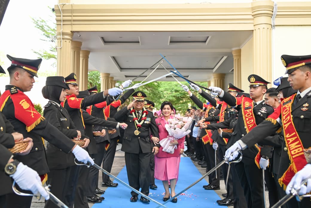 Rangkaian acara ditutup dengan Upacara Tradisi Pedang Pora di Lobi Utama Polda Jambi. Prosesi tersebut menjadi simbol penghormatan terakhir institusi kepada para purna bakti, yang diikuti dengan penuh haru.