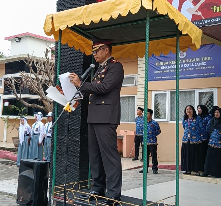 Kota Jambi – jambiaktual.co.id SMKN 2 Kota Jambi melaksanakan upacara Hari Pahlawan 10 November 2025, Senin (10/11) pukul 07.00 WIB. Kepala Sekolah/Kepala Satuan Pendidikan, Dr. Woro Handayani, S.Pd., M.Pd., bertindak sebagai tuan rumah, dengan Inspektur Upacara Kasubdit Bintibsos Ditbinmas Polda Jambi AKBP Dr. Dadang Djoko Karyanto, M.H., M.Pd. Kegiatan diikuti 150 guru dan tenaga kependidikan serta 2.500 siswa.