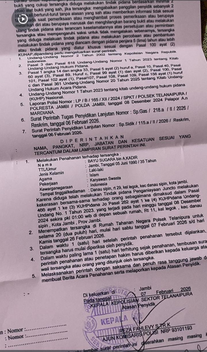 Informasi yang dihimpun menyebutkan, Bayu Sugara diamankan aparat Polsek Telanai pada 6 Februari 2026. Penahanan tersebut disebut ditandatangani langsung oleh Kapolsek Telanaipura, AKP Reza Pahlevi. Namun, pihak keluarga mengaku tidak langsung menerima surat perintah penahanan resmi pada saat penangkapan dilakukan.